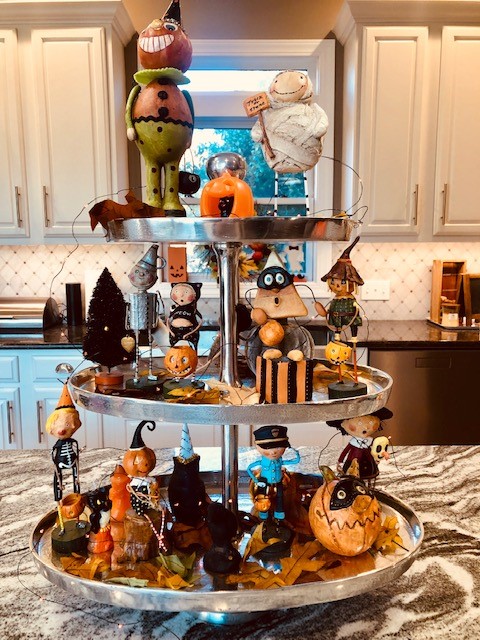 6. A Tiered Stand– There are hundreds of options when it comes to finding the right tiered stand for you or the person you’re buying it for. I’m a lover of all things pewter so I’m showing you mine in the picture below. You can find them in rustic or painted wooden versions, galvanized metals, and even marble. You can use them for a thousand different things! They’re great for parties to arrange cupcakes or other appetizers. You can adorn them with fruit. If the tiers have deep walls, you could place one in the bathroom and roll washcloths or place toilet paper rolls inside the various levels. It’s great for a hot chocolate or a coffee bar to organize the toppings in one place when you’re entertaining. I personally love to decorate mine for the various holidays. It makes for such a festive, lovely centerpiece, especially when you intertwine fairy lights amongst your decorations being displayed. Price points will vary anywhere from around $25 to $100. You can find them at Hobby Lobby, gift shops, Target, Overstock, and other online retailers. It’s time for me to swap out my Halloween decorations for Thanksgiving but here’s my version below.